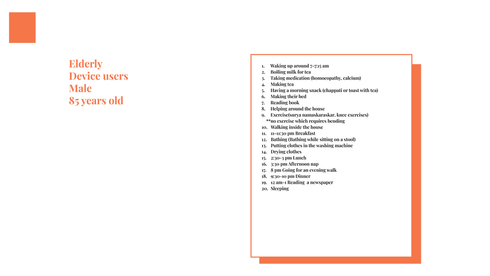 In-depth Interviews: Conducting one-on-one interviews with elderly individuals allowed me to gather qualitative data about their personal experiences and challenges related to mobility. These interviews focused on their daily routines, interactions with existing mobility devices, and emotional responses to their mobility limitations.